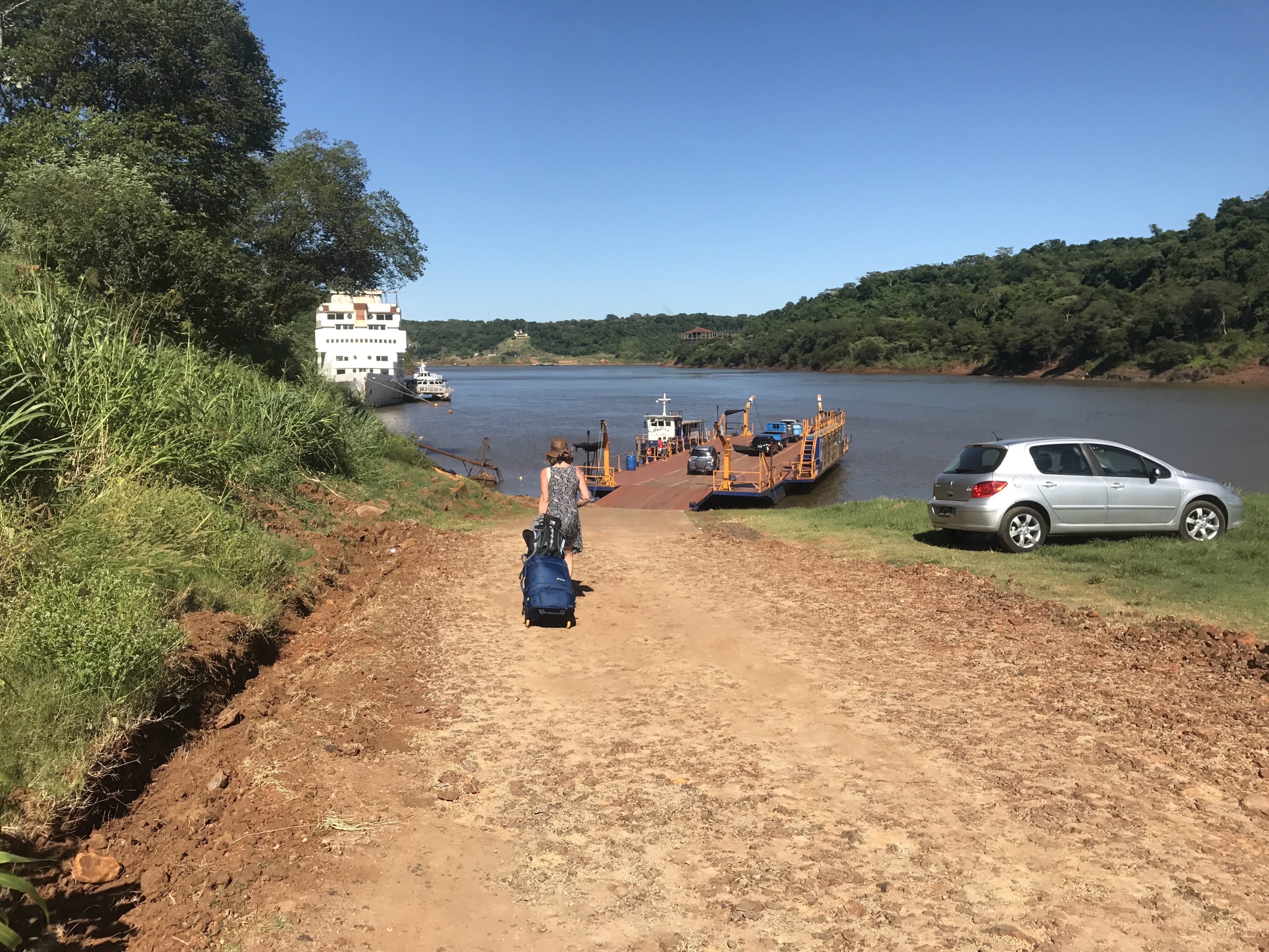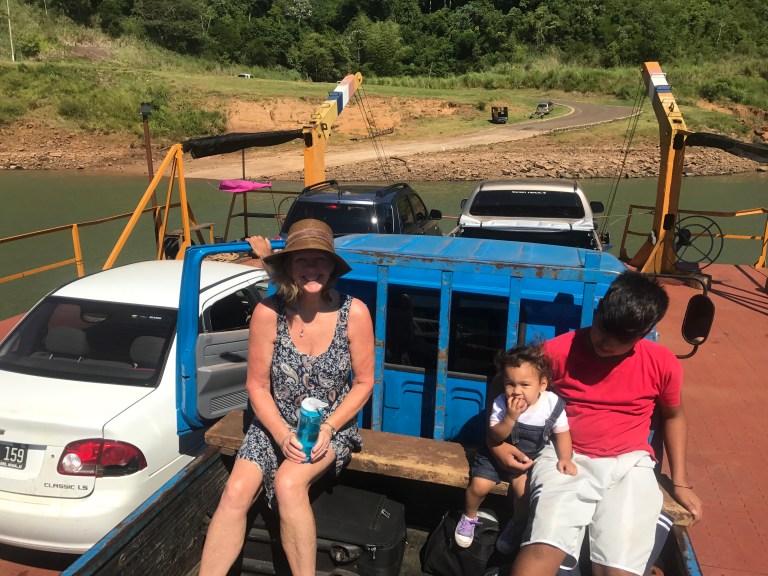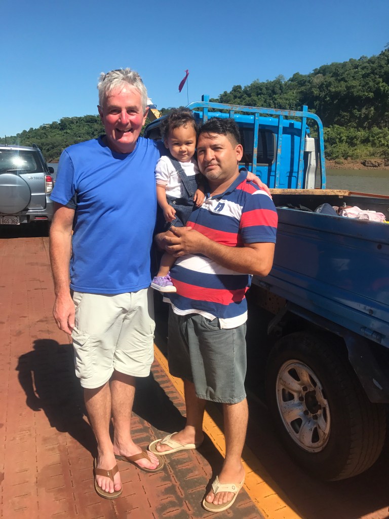 We checked out of the hotel and hailed a taxi to the ‘ferry’ which we’d been watching from our hotel room. It was a simple floating platform with no engine and some benches secured along one side. A tug was latched to the other side which propelled it across the river to Paraguay. Neil immediately set off to chat to a lorry driver. When he came back he confessed that he knew there was no transport for us on the other side. I grinned. This is why we travel so well together. It was an adventure after all.