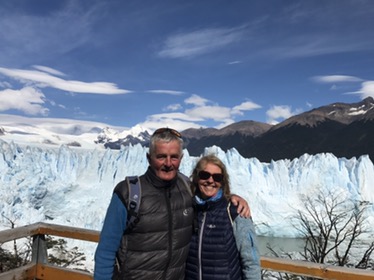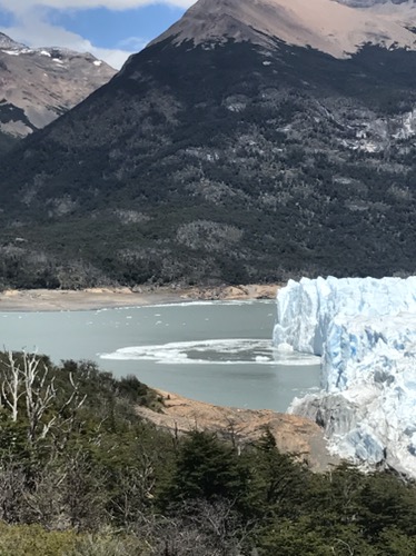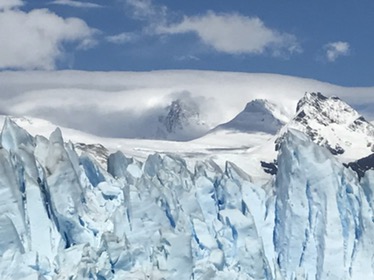 We past the huge turquoise Lake Argentina noticing the new snow which fell last night on the distant hills. Little icebergs floated on the lake, and as we rounded the bends the glacier came into view. It was so exciting to see this dramatic jagged cliff face at the end of the glacier.