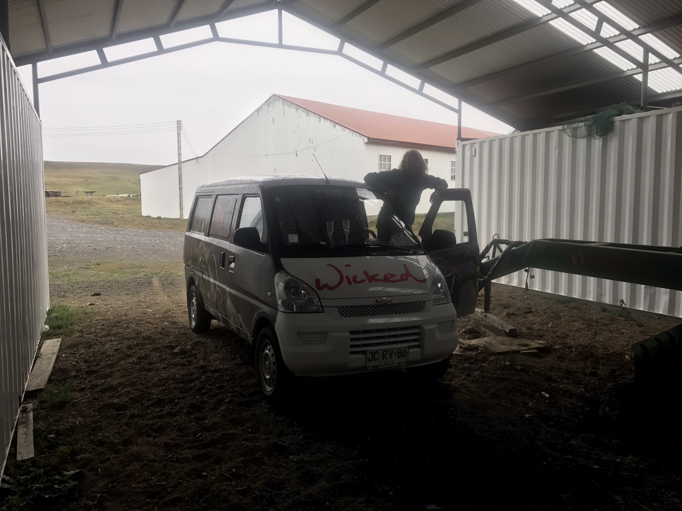 So now it was blowing a gale AND chucking it down. We found a huge, well kept farm near the border with no sign of life, so tucked ourselves in to a sheltered corner of 2 farm buildings for the night. It looked like another gymnastics meal was about to happen with me clambering within the van.