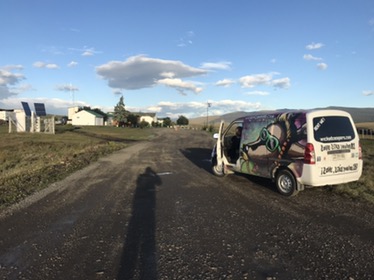He’d researched a long walk we could do to a high viewpoint over the Torres del Paine peaks, so we drove to the car park at the start of the walk. It was a beautiful drive of dirt track, twisting and turning through the undulating countryside and took far longer than we expected. We found a spot at the edge of the campsite where one side of the van opened up to the dramatic view of the mountain peaks. With the other side closed, we could still imagine we we’re alone. The camp site was very eco-friendly in a pretty valley with a meandering river, a luxurious lodge and horses grazing the lush grass.