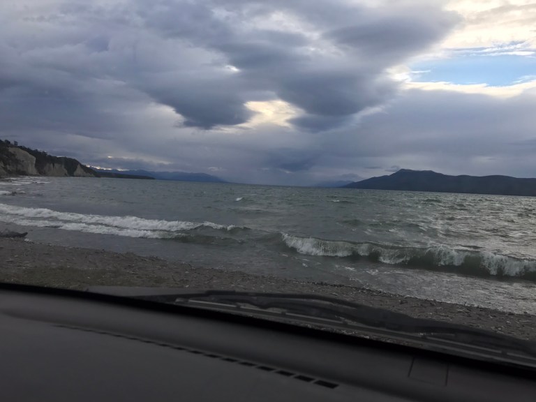 Afterwards, we headed to wild camp at the edge of the nearby lake Fagnano. The wind had whipped it up to look more like a grey sea as we sat in the bar (I.e. our 2 front seats) sipping a G&T, before retiring to the dining room (back of camper) to enjoy another home cooked meal then sleep.