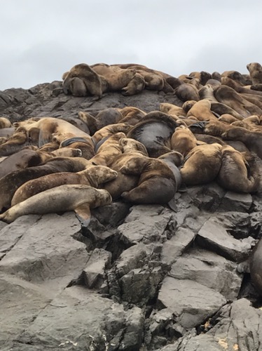 Then we sailed to another large rock full of sea lions. It was full of mothers and cubs with just one enormous slug like male sea lion asleep in the middle. They were all lying almost on top of each other for warmth and were hilarious to watch. Some would cuddle up to others who didn’t want to be cuddled. The snuggly cub would land a flipper on the disgruntled sea lion as he nestled in and persisted in his cuddling. The irritated sea lion would bark at the annoying cub and still it kept cuddling until the other would finally move away. The cuddling sea lion would then find another unsuspecting resting sea lion to annoy and start all over again. We could have watched this go on for hours.