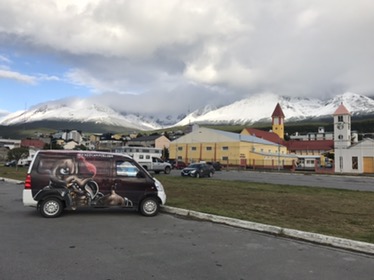 On waking, Neil looked out of the campervan window to see that all that rain we’d had last night had turned to snow, just a few metres higher than us on the mountains behind Ushuaia. It had been a cold night after my midnight escapade.