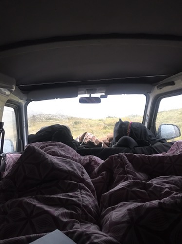 By now, I’d become pretty competent and even happy at cooking and washing up completely inside the van away from wind and rain. We enjoyed our G&T sitting in the front seats watching the seabirds battling against the force of the wind as the sun dipped towards the purple horizon. Despite the constant wind battering the sides of our van, again we slept like babies.