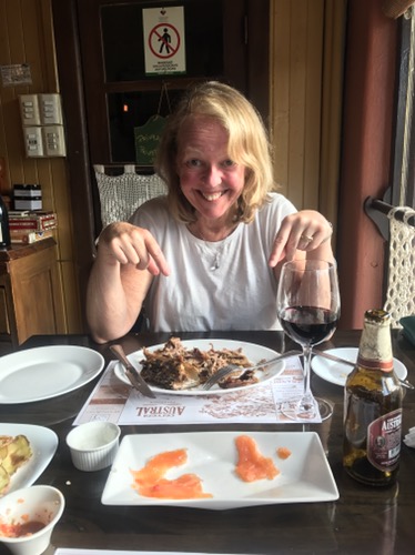 The restaurant next door was a typical Chilean restaurant and had looked very warm and inviting with a lamb being roasted over a big open fire in the corner of the room. I chose the restaurant’s recommended meal which turned out to be a rather large plateful of meat. That’s all! It was the most delicious lamb I’ve ever tasted, but to have no veggies? Neil’s smoked salmon and salad was far more sensible and delicious and I did feel rather naughty. But after enjoying a bottle of smooth Malbec, all was well!! May I’ll eat just veggies for the next few days.