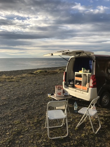 Night was drawing in, so after many hours of driving along the windy Magellan straights, we found a tiny track leading away from the road to the coast. It was a perfect spot to wild camp, unseen from the road and far enough away not to hear the thunder of oil tankers driving by.