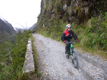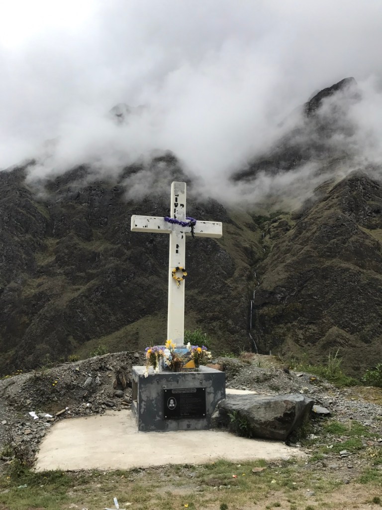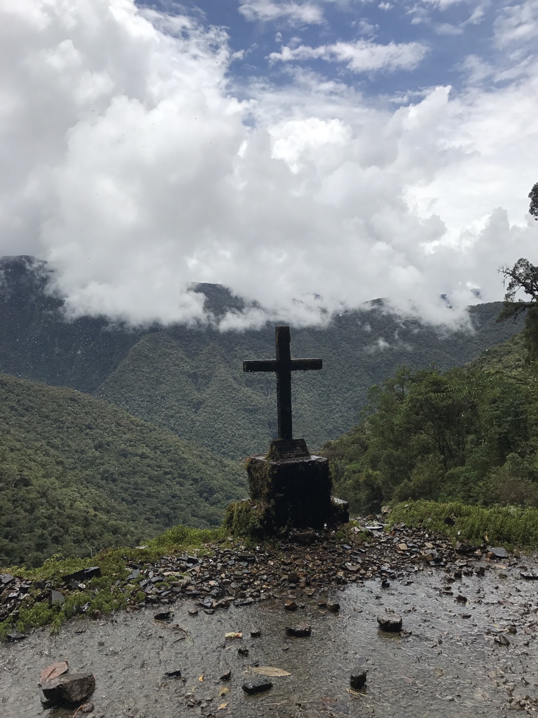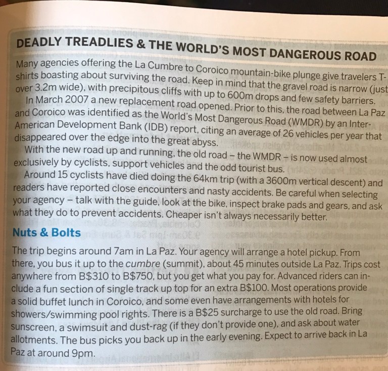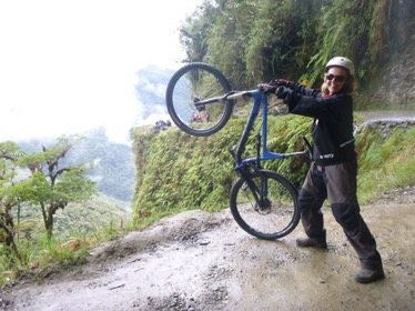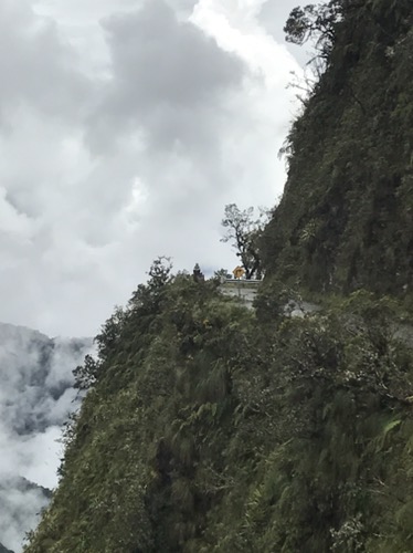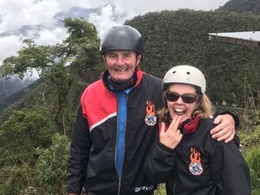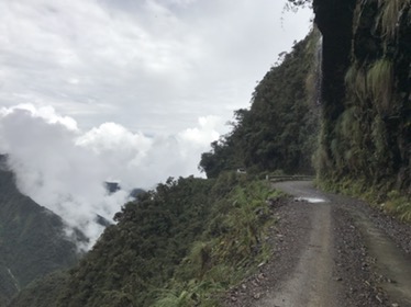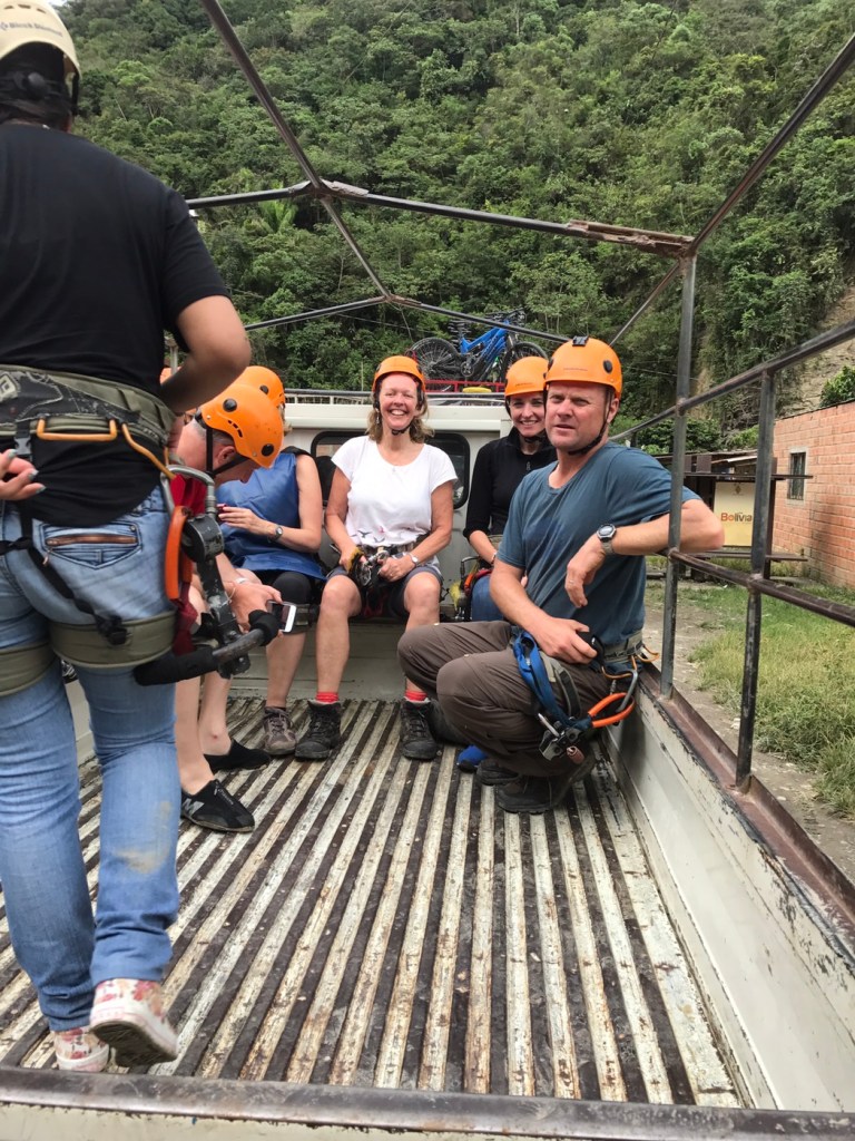 La Paz: What a unique city with cable cars reminiscent of skiing criss crossing the bowl that is La Paz . The Spanish originally founded a city 30 miles away but found it so windy that they then found this valley out of the wind and made it their capital together with the usual torture of the local Amyara people who lived here in the name of Christianity . All they were interested in was gold and silver and of course converting everyone to Catholicism. We spent our first day walking around arranging our trip down the Road of death . It was so called because so many people died building it, mostly Paraguain prisoners from the Chaco war . Bolivia lost huge chunks of land that turned out to be useless anyway but now in Paraguay. It was later used by Top Gear as an adventure for the three desperadoes. The crosses are all of cars or buses that fell off the cliff . However 15 cyclists have died on the 64 km journey down hill from 4,800 metres to 1,200 metres . We chose a top of the range company then with great disc brakes on a KONA frame ….well worth it . At the end of our amazing journey from the clouds to the jungle Ceri had not had enough adrenaline so did a Zip wire to complete an amazing day . The one with the plinth deserves mention. Four political rivals were pushed over the edge by the latest ‘ General Presidente ‘of which Bolivia has had many . Bolivia is now run by its enigmatic Evo Morales who was himself a product of poor campesnos . He has certainly turned Bolivia around from being a basket case economy into a successful country mostly by refusing bribes and handouts from the USA . He has encouraged local use of Coca and stopped its wholesale destruction which the USA wanted . He is part of pink South America and was good friends with Castro and Mandela . He is still a controversial figure however . Why then is there a picture of Ceri with a broken couch . Watching England Wales she jumped up and sat down rather quickly . She fessed up and the owners were most sympathetic and asked for no money