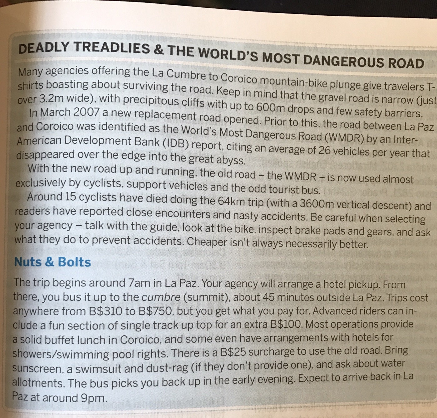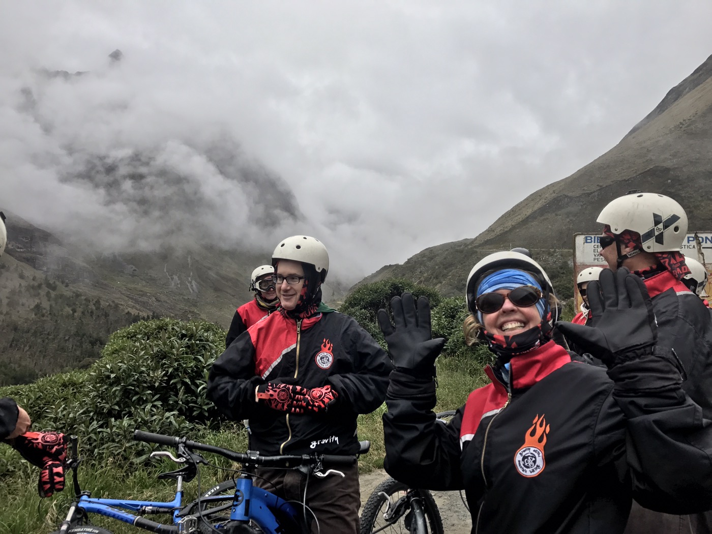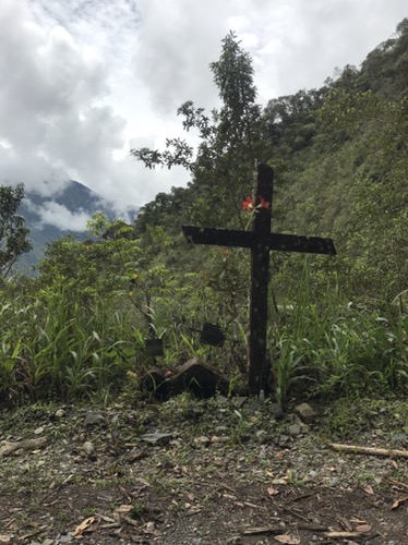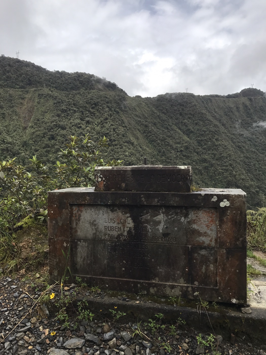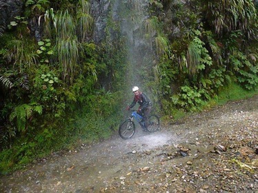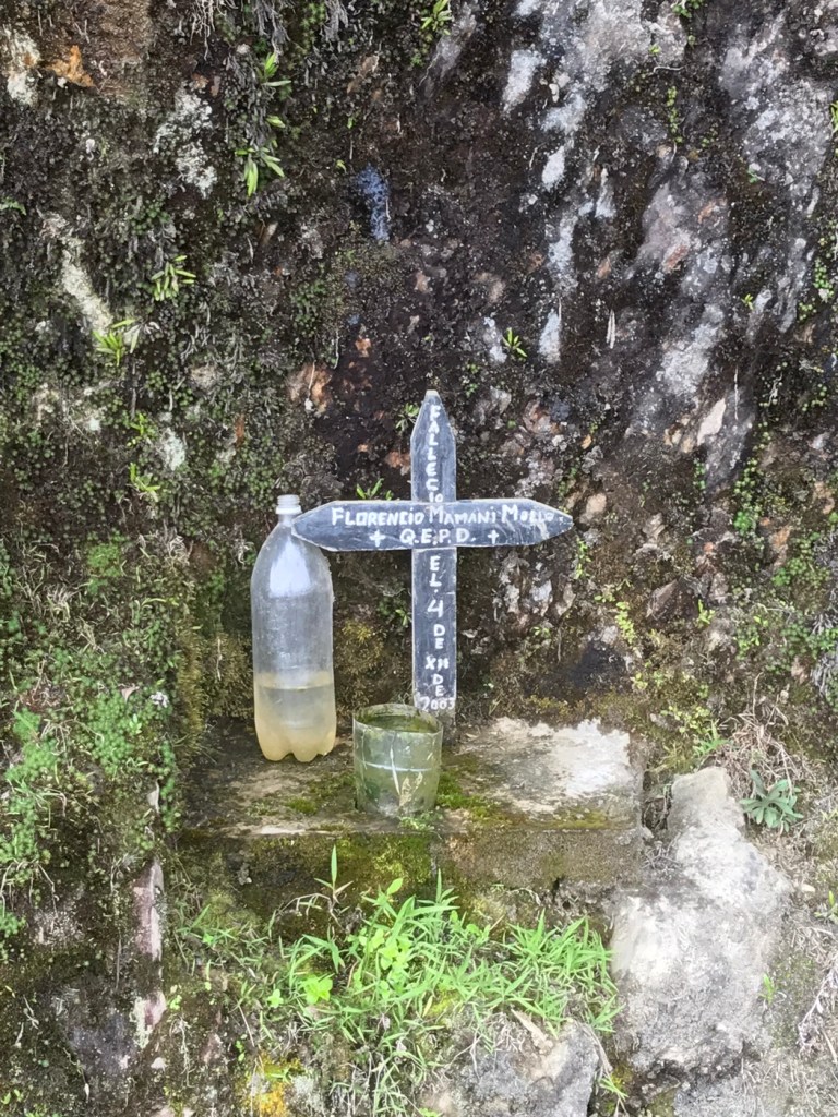 La Paz: What a unique city with cable cars reminiscent of skiing criss crossing the bowl that is La Paz . The Spanish originally founded a city 30 miles away but found it so windy that they then found this valley out of the wind and made it their capital together with the usual torture of the local Amyara people who lived here in the name of Christianity . All they were interested in was gold and silver and of course converting everyone to Catholicism. We spent our first day walking around arranging our trip down the Road of death . It was so called because so many people died building it, mostly Paraguain prisoners from the Chaco war . Bolivia lost huge chunks of land that turned out to be useless anyway but now in Paraguay. It was later used by Top Gear as an adventure for the three desperadoes. The crosses are all of cars or buses that fell off the cliff . However 15 cyclists have died on the 64 km journey down hill from 4,800 metres to 1,200 metres . We chose a top of the range company then with great disc brakes on a KONA frame ….well worth it . At the end of our amazing journey from the clouds to the jungle Ceri had not had enough adrenaline so did a Zip wire to complete an amazing day . The one with the plinth deserves mention. Four political rivals were pushed over the edge by the latest ‘ General Presidente ‘of which Bolivia has had many . Bolivia is now run by its enigmatic Evo Morales who was himself a product of poor campesnos . He has certainly turned Bolivia around from being a basket case economy into a successful country mostly by refusing bribes and handouts from the USA . He has encouraged local use of Coca and stopped its wholesale destruction which the USA wanted . He is part of pink South America and was good friends with Castro and Mandela . He is still a controversial figure however . Why then is there a picture of Ceri with a broken couch . Watching England Wales she jumped up and sat down rather quickly . She fessed up and the owners were most sympathetic and asked for no money