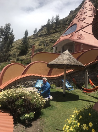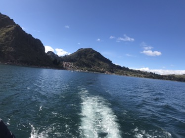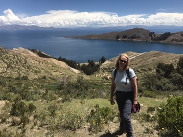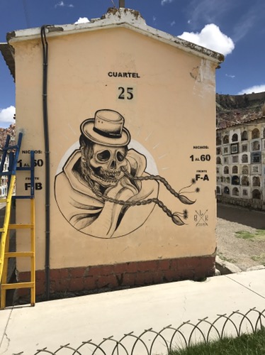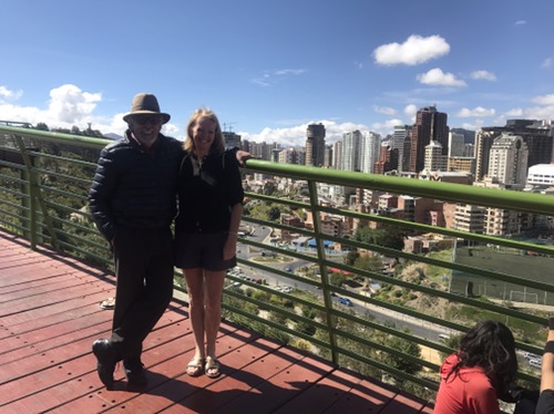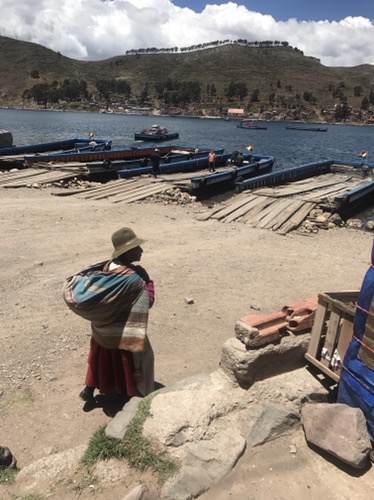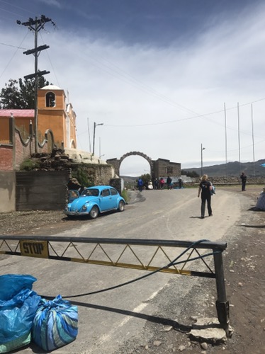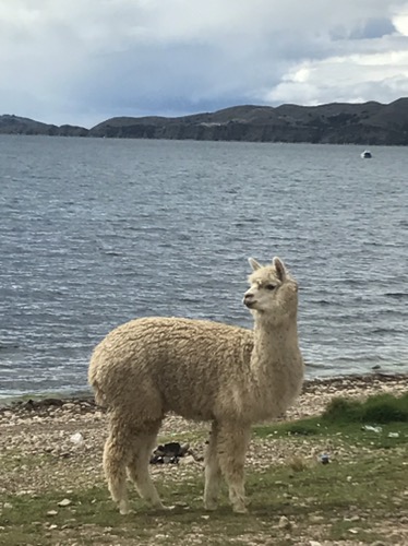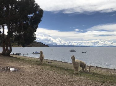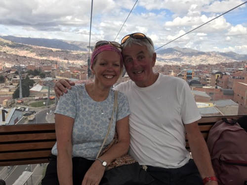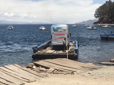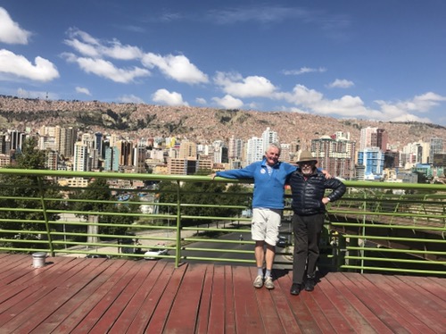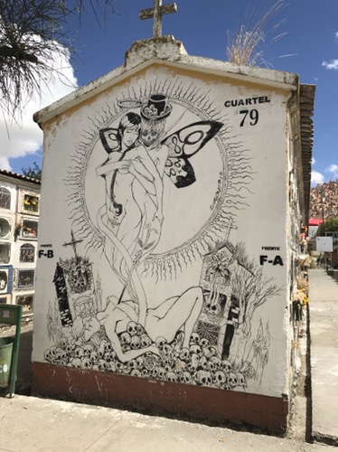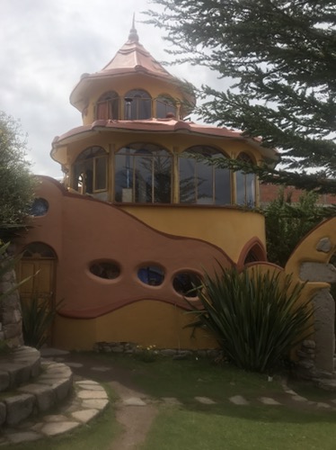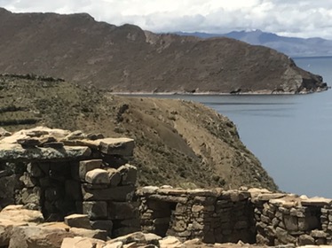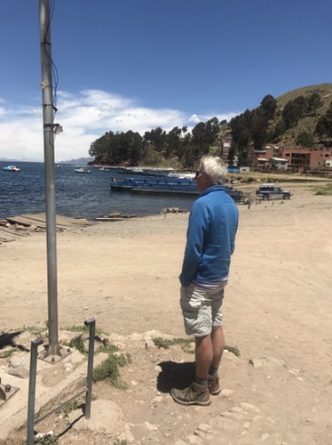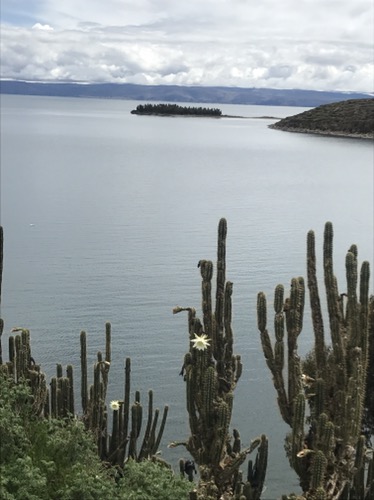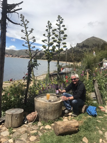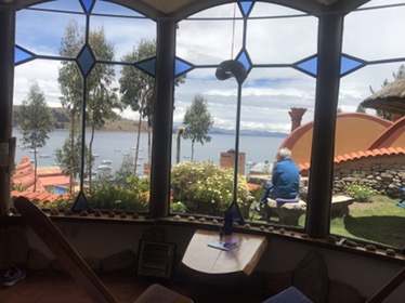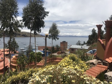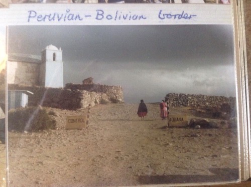La Paz 2 and travel to Titicaca . After the exertions of the ‘ Road of Death’ we needed something quieter so took a walking tour with an excellent quide who had lived in England for 10 years . First stop the cemetery. Not at all like an English one ! They believe your spirit stays with you and the family for 5 years , so most people visit the cemetery quite often and maybe have lunch there . After 5 years the spirit leaves so often the site maybe re used . You then buy a skull doesn’t matter which one and have it in your house as a sort of shrine for perpetuity! Next a trip by cable car . La Paz has solved its traffic problem by installing three and six more planned , built in Austria and subsidised by government it is a very elegant solution to their traffic issues . It costs 40p to ride . We went to the top to its coterminous city El Alto , firstly for a great view then a trip to a witches market and a fortune teller. If you build a house you need to put a dead animal at its base . The size of the house denotes the size of the animal . Very large buildings apparently have a tramp or drunk who is befriended by the owner of the new building or their agent . I had my fortune taken and he said Leeds United would get promoted !! I asked him 3 questions through an interpreter as he only spoke Amyara . The other language is Quechua which is kept very much alive as it is taught in schools now along with Spanish. Our hosts in La Paz have a lovely house with 3 generations of family living there (airbnb ). The grandfather Eduardo took us on a lovely walk across La Paz next day . He was a diplomat in Europe and we learnt a lot from him with his Begian wife . Today was the 14th so we went to a lovely French restaurant he recommended. We went about 8.30 and were first there ! They eat late ! Too soon it was time to leave . La Paz was truly a great city to visit. An unusual bus journey involving a ferry where the bus goes separately on a raft across the straights of Taquina took us to Copacobana.. no not the Brazilian one but Bolivian one ! Situated at the bottom of Lake Titicaca it is in a lovely setting sheltered by a hill at the back . Titicaca is full of superlatives . Highest navigable Lake in the world is enough for me , over 60 miles long and straddled the border between Bolivia and Peru . I came here in 1979 with Chris and I have dim memories of no electricity and a cold shower , it has certainly grown in the intervening 38 years but kept its charm , no more so in the accommodation we found ( thanks to the Guardian) . Las Olas should be renamed Las Gaudi , each small house was stunning in its architecture and design . We booked originally for 2 nights but stayed for 4 . Ceri made the most delightful Quinoa soup which we used for several meals . I found some delicious local sheeps cheese which had a very strong aroma . Ceri thoughtfully declined it while I tucked in with gusto . The sheep had its revenge with the famed ‘Inca two step ‘ That put paid to one day . Every cloud has a silver lining as we had to delay our trip to the Isla del Sol due to my dietary indiscretions!! The next day beckoned warm and sunny for our boat trip. A lovely walk across an island steeped in Inca history and stunning scenery . The altitude takes it toll and any up hill takes time . It’s as if you are running with a huge respiratory effort but your only walking . Our Himalayan knowledge comes in very helpful to us both . Sandwiches made for a walk always taste wonderful and so it proved today . All too soon it is time to set our minds to Peru . Tessa kindly sent me a picture of the border which I took in 1979 . I showed it to the border officials on the Bolivian side . I managed to stop all immigration for a spell as they wanted copies . We are now in Puno just about to catch a ferry out onto the lake for a night on Amantani island with local Amyarans who put you up . We are to be picked up at 07.40 so I had better get up and make hay as they say . Here are some pics which cover this last 6 days