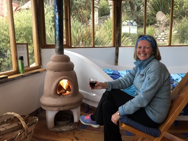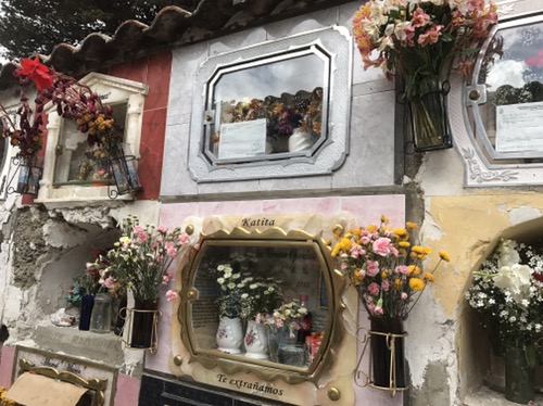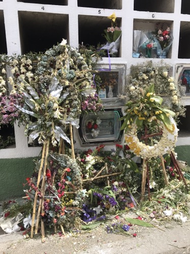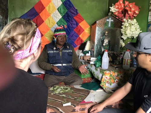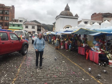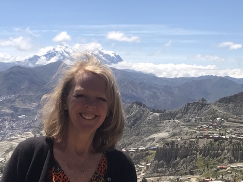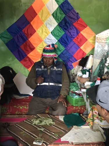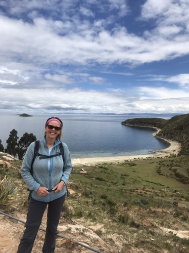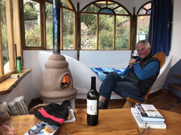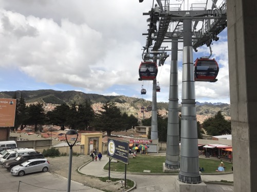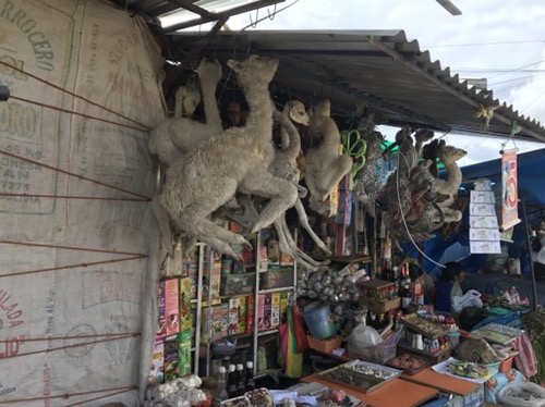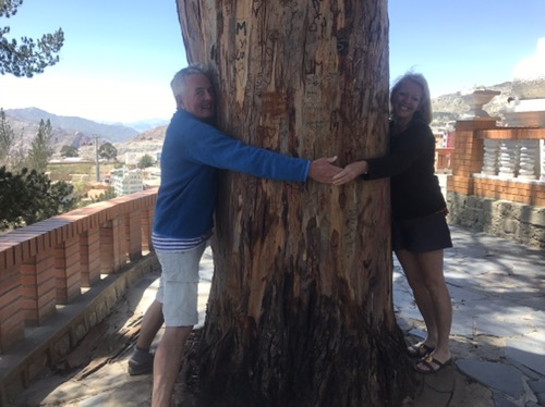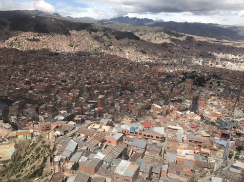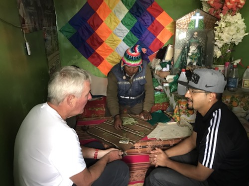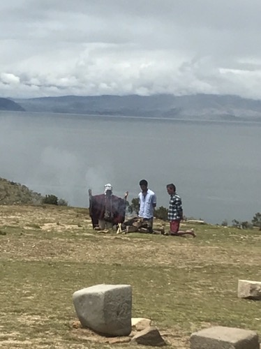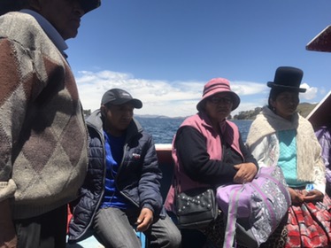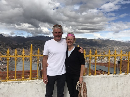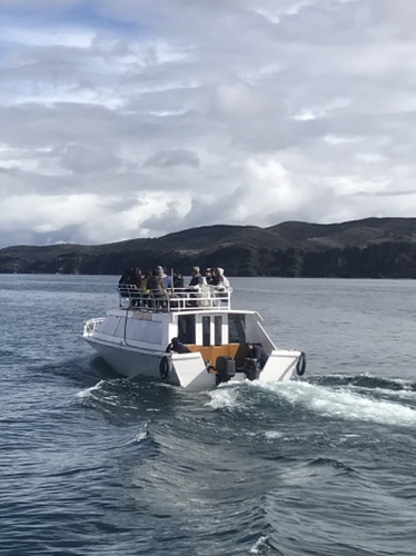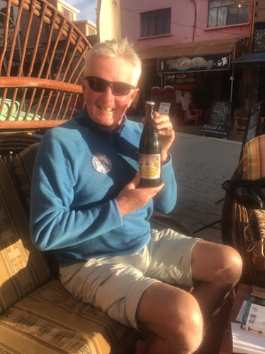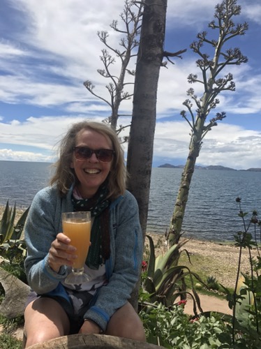 La Paz 2 and travel to Titicaca . After the exertions of the ‘ Road of Death’ we needed something quieter so took a walking tour with an excellent quide who had lived in England for 10 years . First stop the cemetery. Not at all like an English one ! They believe your spirit stays with you and the family for 5 years , so most people visit the cemetery quite often and maybe have lunch there . After 5 years the spirit leaves so often the site maybe re used . You then buy a skull doesn’t matter which one and have it in your house as a sort of shrine for perpetuity! Next a trip by cable car . La Paz has solved its traffic problem by installing three and six more planned , built in Austria and subsidised by government it is a very elegant solution to their traffic issues . It costs 40p to ride . We went to the top to its coterminous city El Alto , firstly for a great view then a trip to a witches market and a fortune teller. If you build a house you need to put a dead animal at its base . The size of the house denotes the size of the animal . Very large buildings apparently have a tramp or drunk who is befriended by the owner of the new building or their agent . I had my fortune taken and he said Leeds United would get promoted !! I asked him 3 questions through an interpreter as he only spoke Amyara . The other language is Quechua which is kept very much alive as it is taught in schools now along with Spanish. Our hosts in La Paz have a lovely house with 3 generations of family living there (airbnb ). The grandfather Eduardo took us on a lovely walk across La Paz next day . He was a diplomat in Europe and we learnt a lot from him with his Begian wife . Today was the 14th so we went to a lovely French restaurant he recommended. We went about 8.30 and were first there ! They eat late ! Too soon it was time to leave . La Paz was truly a great city to visit. An unusual bus journey involving a ferry where the bus goes separately on a raft across the straights of Taquina took us to Copacobana.. no not the Brazilian one but Bolivian one ! Situated at the bottom of Lake Titicaca it is in a lovely setting sheltered by a hill at the back . Titicaca is full of superlatives . Highest navigable Lake in the world is enough for me , over 60 miles long and straddled the border between Bolivia and Peru . I came here in 1979 with Chris and I have dim memories of no electricity and a cold shower , it has certainly grown in the intervening 38 years but kept its charm , no more so in the accommodation we found ( thanks to the Guardian) . Las Olas should be renamed Las Gaudi , each small house was stunning in its architecture and design . We booked originally for 2 nights but stayed for 4 . Ceri made the most delightful Quinoa soup which we used for several meals . I found some delicious local sheeps cheese which had a very strong aroma . Ceri thoughtfully declined it while I tucked in with gusto . The sheep had its revenge with the famed ‘Inca two step ‘ That put paid to one day . Every cloud has a silver lining as we had to delay our trip to the Isla del Sol due to my dietary indiscretions!! The next day beckoned warm and sunny for our boat trip. A lovely walk across an island steeped in Inca history and stunning scenery . The altitude takes it toll and any up hill takes time . It’s as if you are running with a huge respiratory effort but your only walking . Our Himalayan knowledge comes in very helpful to us both . Sandwiches made for a walk always taste wonderful and so it proved today . All too soon it is time to set our minds to Peru . Tessa kindly sent me a picture of the border which I took in 1979 . I showed it to the border officials on the Bolivian side . I managed to stop all immigration for a spell as they wanted copies . We are now in Puno just about to catch a ferry out onto the lake for a night on Amantani island with local Amyarans who put you up . We are to be picked up at 07.40 so I had better get up and make hay as they say . Here are some pics which cover this last 6 days