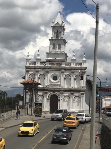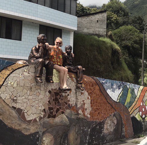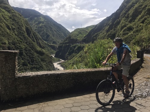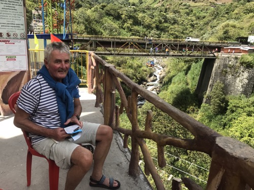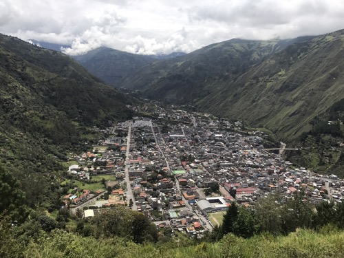 Ecuador continues to enthral us both . It really has everything. As usual it takes 2 minutes max to get a bus from Vilcabamba first to Loja then a 20 minute wait to Cuenca by mid afternoon. It is a delightful city with mountains all around but lovely Spanish squares and architecture. We stay 3 nights here and enjoy the city . It is famous for Panama hats . We took a walking tour round the city which was rather lack lustre in content . We met a lovely Canadian couple during the tour and I persuaded Ceri to enjoy a beer as it was happy hour at lunch time . I bought a lovely hat to replace the one Anthony had bought me many years ago . We found a nice restaurant one evening and happened on a man with a heavy nose bleed . Conversations ensued and help from me . Discovered their best friends lived in Culm Davey !! Art gallery number 43 visited which resulted in an invitation to an opening of an exhibition and a free glass of bubbly … 44 then ! We met a mercurial potter their which we had visited earlier in the day . Ceri fell in love with a lovely pot . At least she said it was lovely so I have to believe her . I couldn’t see where to store the pens and pencils. Isn’t that what pottery is about . I do feel a philistine at times but I know which beer I prefer . However Ceri came to my rescue later . We have planned to go to the Galapagos for some time and secured some late late booking at a good price . So far so good . The company need payment up front …..Suffice to say that it took 4 hours to successfully pay the company in Quito from bank account . Lovely Barclays suspected fraud so stopped any payment and all cards .. so phone calls to UK and fraud squad . ‘ Please hold we value your call ‘ Eventually i hand the phone to Ceri as I am losing the will to live ….. anyway we’re in 8 days on a small boat … more later . Sorry to leave Cuenca. Bus to Banos then …. wait … 3 mins ! Via Riobamba . One of the glorys of travelling by bus is that you see life as it is . Every bus tourney is a series of buying opportunities. On average each say 6 hour journey will have at least 15 local people getting on and off the bus selling .,,. crisps / sweets / ice lollies/ apples oranges melons / pens/ toothbrushes/ jewellery . Most stay on for 5-10 kms then get off and go back the other way on the road . Father and son do a double act sort of play from one end of the bus to the other all in Spanish . We understand little but they deserve their money . I should say that on one of these lovely journeys I must have had my laptop stolen from rack above us . The bus was very full with people standing . Sleep overcomes from time to time , you may say why did I bring a laptop round South America? In my fledgling career as examiner in Extreme Medicine,I need to mark various submissions for the new MSc starting in Exeter. Impossible to do on an IPhone. Anyway ”tis gone .