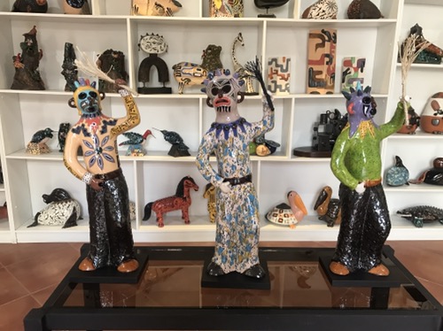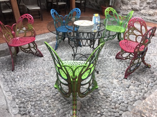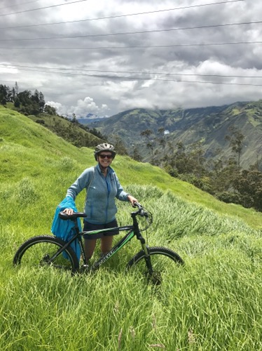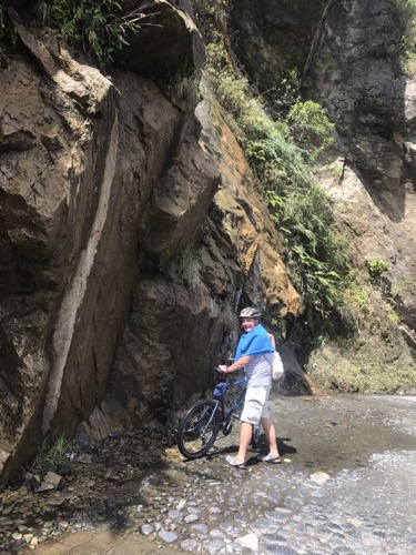Banos is great full on adrenaline place . We stay 2 nights . We get a lift up on the back of a truck to a high mountain ledge with bicycles and proceed down hill for 2,000 metres or so whizzing down gorges and watch people zip wire across the valley . In the evening we find lovely warm thermal springs … our third ones on our trip and then a beautiful meal in Posada Del Arte ….. yes more art !